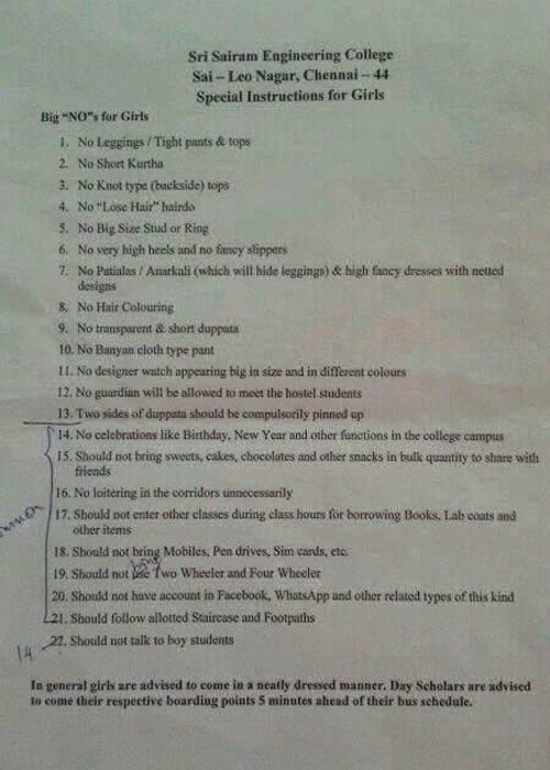 फेसबुक व वॉट्सएप पर लड़कियों के खाते नहीं होंगे। लड़कियां, लड़कों से बात नहीं करेंगी.. छोटे कपड़े नहीं पहनेंगी और दुपट्टा अनिवार्य है। कॉलेज ने यह पाबंदी भी लगाई है कि हॉस्टल में रहने वाले छात्र-छात्राएं अपने अभिभावकों से भी नहीं मिल सकते। लड़कियां ना जन्मदिन मना सकेंगी ना ही गा बजा सकेंगी।