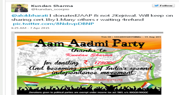 कुंदन ने एक और ट्वीट में कहा है कि उसने अपनी कार केजरीवाल को नहीं बल्कि पार्टी को दान की थी। उन्होंने अपने ट्वीट के साथ दान में दी गई राशि का सर्टिफिकेट भी शेयर किया है। इसके मुताबिक उन्होंने पार्टी को 1 लाख 75 हजार रुपये दान दिए थे।