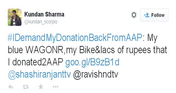 दरअसल, लंदन में रहने वाले सॉफ्टवेयर इंजीनियर कुंदन शर्मा ने आप पार्टी को यह कार दान में दी थी और अब उन्होंने ट्वीट के जरिये अपनी नाराजगी जताते हुए अपनी मांग सामने रखी है।