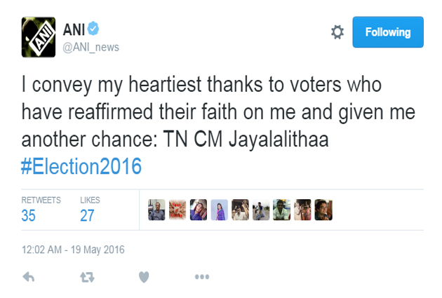 तमिलनाडु में जीत की राह पर फिर लौटीं जयललिता ने जनता को बधाई दी। उन्होंने कहा कि जनता ने मुझ पर एक बार फिर भरोसा दिखाया है। इसके लिए मैं तमिलनाडु की जनता का दिल से शुक्रिया अदा करती हूंं।उन्होंने कहा कि द्रमुक परिवार की राजनीति का अंत हो गया है।