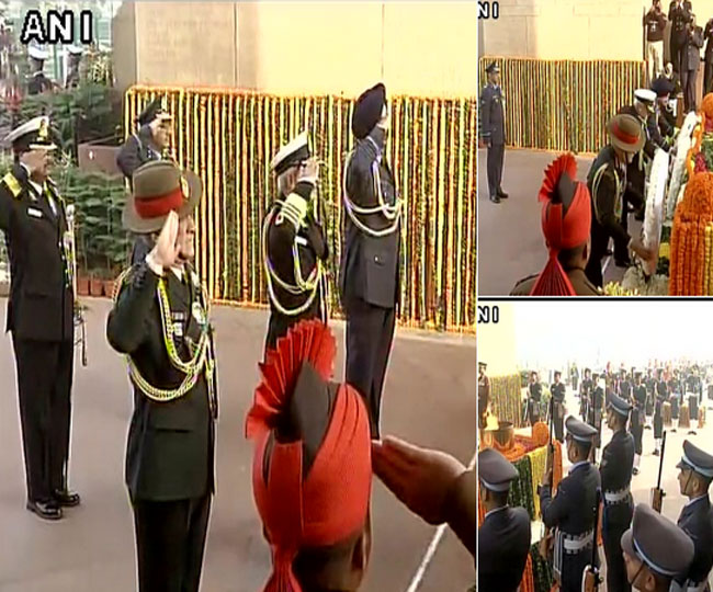 (सेना प्रमुख जनरल बिपिन रावत, वायु सेना प्रमुख बी एस धनोआ और भारतीय नौसेना सुनील लांबा ने अमर जवान ज्योति पर शहीद जवानों को दी श्रद्धांजलि)