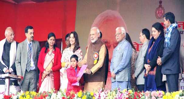 उन्होंने अंतऱिक्ष परी कल्पना चावला की उल्खेख किया। उन्होंने कहा कि अवसर मिले तो बेटियों बेटों से ज्यादा कमाल करके दिखाती हैं। शिक्षा क्षेत्र में 70-75 प्रतिशत से ज्यादा महिलाएं हैं। चिकित्सा क्षेत्र में 60 प्रतिशत से ज्यादा महिलाएं हैं। खेतों में भी महिलाएं बढ़चढ़ काम करती हैं। उन्होंने अभिनेत्री माधुरी दीक्षित की तारीफ करते हुए कहा कि उनकी मां आइसीयू में जिंदगी का जंग लड़ रही हैं और बेटी पानीपत में जंग लड़ने आई हैं। अपनी बीमार मां को छोड़ कर माधुरी आपकी बेटी को बचाने के लिए आपके बीच आई हैं। ऐसा कमिटमेंट व जिम्मेदारी का भाव होना चाहिए। उन्होंने कहा कि बेटी बचाओ, बेटी पढ़ाओ पर निरंतर बल देना है। पचास साल से चली आ रही इस समस्या को दूर करने के लिए सौ वर्षों तक लगातार प्रयास करना होगा। उन्होंने सुकन्या समृद्धि योजना के बारे में बताया कि दस वर्ष की आयु तक की बच्चियों का यह खाता खुलेगा। इसके तहत जमा धन पर कोई टैक्स नहीं लगेगा।