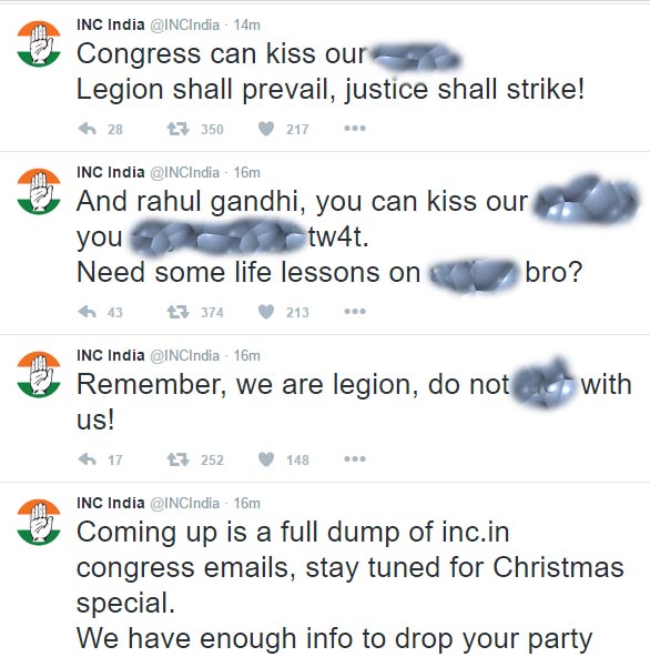 कांग्रेस के ट्विवटर हैंडल पर हैकर ने कई आपत्तिजनक बातें लिखी हैं। बातें इतनी आपत्तिजनक हैं कि उन्हें ज्यों का त्यों यहां न तो लिखा जा सकता है न ही दिखाया जा सकता है। इसलिए ट्विटर हैंडल के प्रिंट स्क्रीन से आपत्तिजनक शब्दों को हटा दिया गया है।
