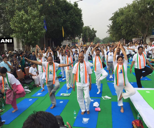 अंतरराष्ट्रीय योग दिवस पर उपराज्यपाल अनिल बैजल, सीएम अरविंद केजरीवाल, केंद्रीय मंत्री वेंकैया नायडू ने दिल्ली में योग किया।