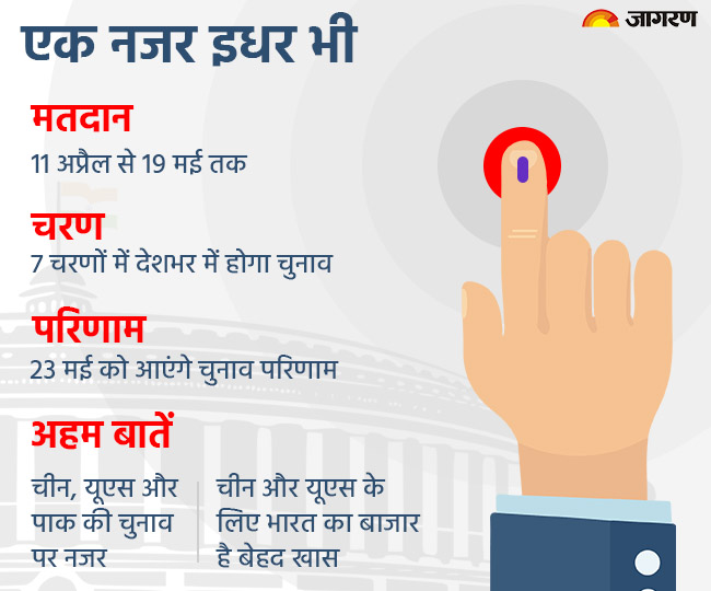 नई दिल्ली [जागरण स्पेशल]। भारत में होने वाले लोकसभा चुनाव पर यूं तो पूरी दुनिया की निगाहें लगी हुई हैं, लेकिन इनमें भी कुछ देश ऐसे हैं जो इन चुनावों पर विशेषतौर पर निगाह रखे हुए हैं। इसके पीछे एक नहीं कई वजह हैं। इनमें पहली और सबसे बड़ी वजह भारत का बढ़ता बाजार है, जिसको अपनी तरफ करने में कोई देश पीछे नहीं रहना चाहता है। बहरहाल, सबसे पहले हम उन देशों की बात कर लेते हैं जिनकी विशेष निगाह भारत के चुनाव पर लगी है और क्यों। गौरतलब है कि भारत में 11 अप्रैल से चुनाव होने हैं। पूरे देश में सात चरणों में मतदान करवाए जाएंगे। इसका अंतिम चरण का मतदान 19 मई को होगा 23 मई को चुनाव का परिणाम सभी के सामने आ जाएगा।