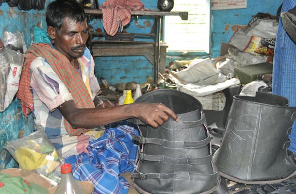 हाथियों को नंगे पैर चलने से होने वाली परेशानी से निजात दिलाने के लिए एक हाथी पालक की पहल पर नालंदा जिले की चमड़ा मंडी में मोची हाथियों के लिए जूते बनाने में जुटे हैं।