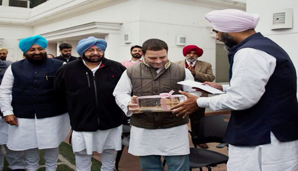 शुक्रवार को नई दिल्ली में मुलाकात के दौरान राहुल गांधी को तोहफा भेंट करते मनप्रीत बादल।