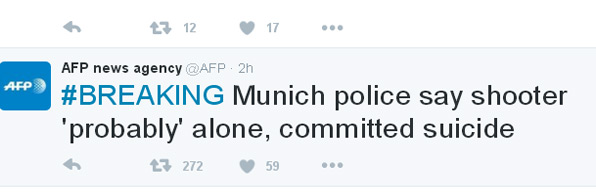 पुलिस शॉपिंग सेंटर में फायरिंग के बाद पुलिस ने उसकी चारो तरफ से घेराबंदी कर दी जर्मनी मीडिया की खबरों के मुताबिक, इस गोलीबारी में कई लोगों के मारे गए हैं। इससे पहले, पुलिस प्रवक्ता ने बताया कि उनके पास फिलहाल इस बात की कोई जानकारी नहीं है कि इस घटना में अब तक कितने लोग मारे गए हैं या फिर इसके पीछे किसका हाथ है।