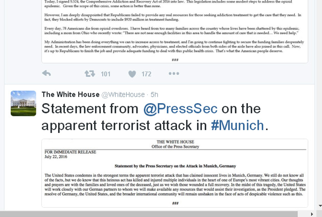 अमेरिकी राष्ट्रपति बराक ओबामा ने म्यूनिख हमले की जानकारी मिलते ही कहा कि वे दुख की इस घड़ी में जर्मनी के साथ हैं। साथ ही वे जर्मनी की हर संभव मदद करेंगे।