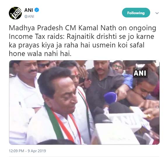 पर्चा दाखिल करने के बाद मध्य प्रदेश में अधिकारियों के यहां मारे जा रहे आयकर विभाग के छापों पर कमलनाथ ने कहा कि ये छापे सियासत साधने के मकसद से मारे जा रहे हैं। उन्होंने बिना किसी का नाम लिए कहा कि राजनीतिक दृष्टि से जो करने की कोशिश की जा रही है, उसमें कोई भी सफल होने वाला नहीं है।