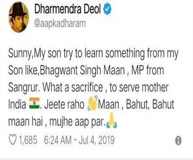 दरअसल, एक यूजर ने सनी देयोल की मुंबई एयरपोर्ट से बाहर आते की एक फोटो ट्विटर पर शेयर कर उसमें सनी की डैशिंग (प्रभावशाली) लुक का जिक्र किया था। इसी तस्वीर का जवाब देते हुए धर्मेंद्र ने सनी को सलाह दी कि वह मान से कुछ सीखें। धमेंद्र ने ट्वीट किया-'सनी, मेरे बेटे, कोशिश करो कि संगरूर के सांसद भगवंत सिंह मान जो कि मेरे बेटे जैसा है, उससे कुछ सीखो। भारत मां की सेवा करने के लिए क्या त्याग किया है.. जीते रहो...मान। बहुत बहुत मान है मुझे आप पर...।'