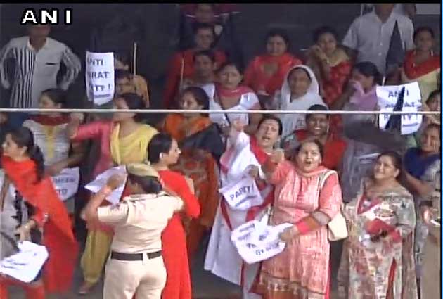 केजरीवाल को चूडि़यां दिखातीं महिलाएं।