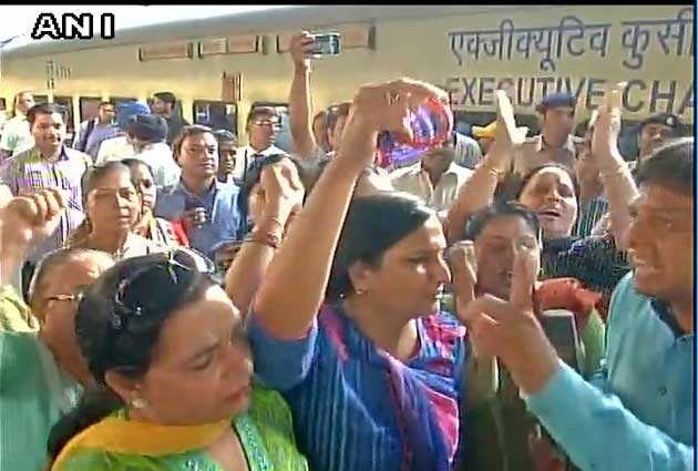 शताब्दी एक्सप्रेस के लुधियाना स्टेशन पर पहुंचने के बाद केजरीवाल जैसे ही ट्रेन से निकले अकाली दल और कांग्रेस के कार्यकर्ताओं ने नारेबाजी शुरू कर दी। इनमें महिलाओं की संख्या खासी थी। कार्यकर्ता केजरीवाल को काले झंडे दिखा रहे थे और महिलाओं ने उन पर चूडि़यां भी फेंकी।