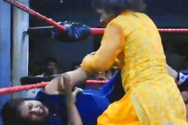 कविता को रिंग में खींच कर ले जाती रेसलर बुलबुल।