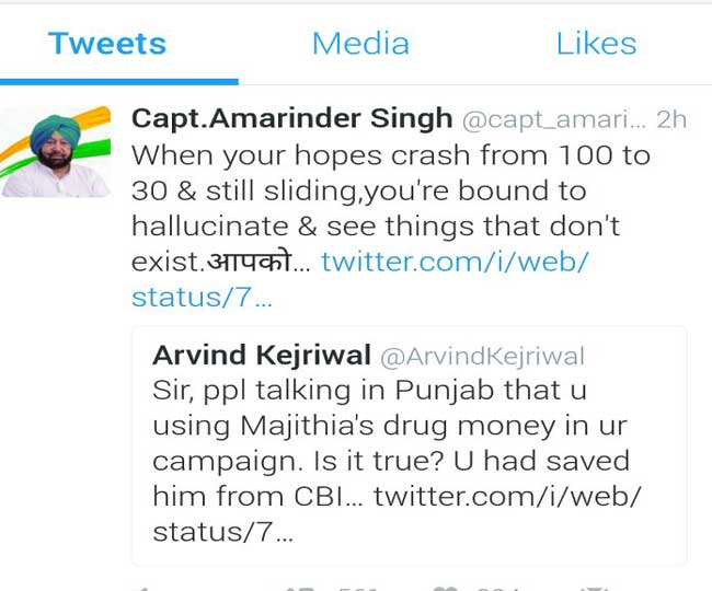 दोनों नेताओं का ट्विटर पर वाद विवाद काफी वायरल हो रहा है और काफी संख्या में लोग इस पर टिप्पणी कर रहे हैं। पंजाब की राजनीति में केजरीवाल और कैप्टन अमरिंदर का यह ट्वीट वार चर्चित हो रहा है। दोनों नेताओं के बीच चले ट्वीट वार की बानगी-
