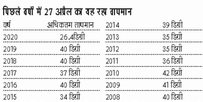 लॉकडाउन में कई तरह के रिकार्ड कायम हुए हैं। मौसम ने भी रिकार्ड बनाया है। गत दिवस का तापमान अन्य वर्षों की अपेक्षा काफी कम रहा।