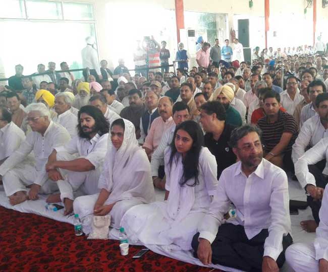विनोद खन्ना को श्रद्धांजलि देने के लिए बैठे पारिवारिक सदस्य व लोग।