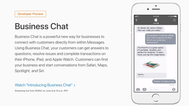 यह बिजनेस का एक नया तरीका है, जिसमें मैसेज के जरिए यूजर्स से कनेक्ट हुआ जा सकता है। बिजनेस चैट के जरिए यूजर्स अपने सभी सवालों के जवाब पाना, समस्याओं को हल करना और अपने आईफोन, आईपैड और एप्पल वॉच की पूरी ट्रांजैक्शन की जानकारी ले पाएंगे। यहां ग्राहक आपका व्यवसाय ढूंढ सकते हैं और सफारी, मैप्स, स्पॉटलाइट और सिरी से बातचीत शुरू कर सकते हैं। नीचे दी गई फोटो के आधार पर यह कहा जा सकता है कि एप्पल, बिजनेस चैट को अपने ग्राहकों से भी कनेक्ट होने के लिए भी इस्तेमाल करेगा।
