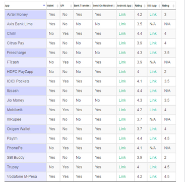 नई दिल्ली। नोटबंदी के चलते लोगों को कैश की किल्लत से जूझना पड़ रहा है। हालांकि, डिजिटल पेमेंट ने इस परेशानी को काफी हद तक कम कर दिया है। इसी के चलते हम आपके लिए कुछ ऑनलाइन पेमेंट मोबाइल एप्स के ऑप्शन लाएं हैं, जो बिल भुगतान, बैंक ट्रांसफर जैसी सुविधाएं देती हैं। नीचे दी गई तस्वीर में आप देख पाएंगे की आप किस एप के जरिए किस तरह का लेन-देन कर सकते हैं।