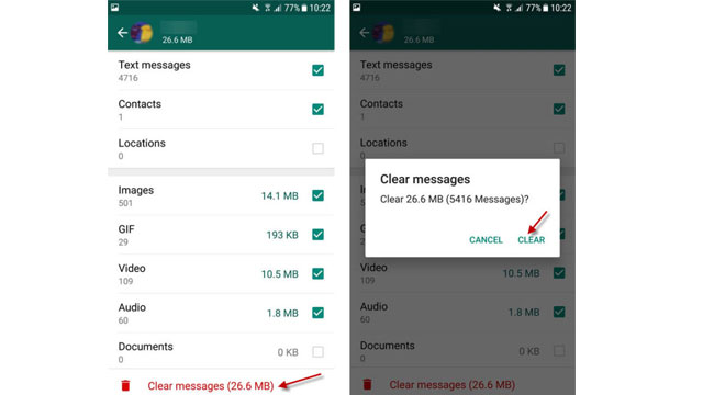 - अगर आप Manage Message पर क्लिक करेंगे तो आप फाइल्स को सेलेक्ट और अनसेलेक्ट कर पाएंगे।इनमें से आप चयन कर सकते हैं की किन फाइल्स को आपको रखना है और किन्हें डिलीट करना है।उदाहरण के लिए- अगर आपको किसी चैट में से सिर्फ वीडियोज को डिलीट करना है, तो सिर्फ वीडियोज को सेलेक्ट करें। ऐसा करने के बाद Clear messages पर क्लिक करें और आपका काम हो जाएगा।