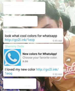 इस मैसेज में लिखा है, “आई लव द न्यू कलर ऑफ द व्हाट्सएप”। इस मैसेज के साथ यूजर्स को इसका Fake URL भी भेजा जा रहा है। इस वेबसाइट पर क्लिक करने के बाद कुछ यूजर्स के स्मार्टफोन्स में एडवेयर एप डाउनलोड होने की शिकायत भी सामने आई है। जैसे ही आपके फोन में एडवेयर एप डाउनलोड होगी आपको बताया जाएगा की व्हाट्सएप्प के कलर सिर्फ व्हाट्सएप् की वेबसाइट पर ही उपलब्ध हैं। साथ ही यह भी कहा जाएगा कि इसके लिए यूजर्स को Blackwhite नाम की एप डाउनलोड करनी होगी। लेकिन इस Fake URL के चलते गूगल प्ले स्टोर से इस एप को बैन कर दिया गया है। इस मैसेज का स्क्रीनशॉट आप नीचे देख सकते हैं।