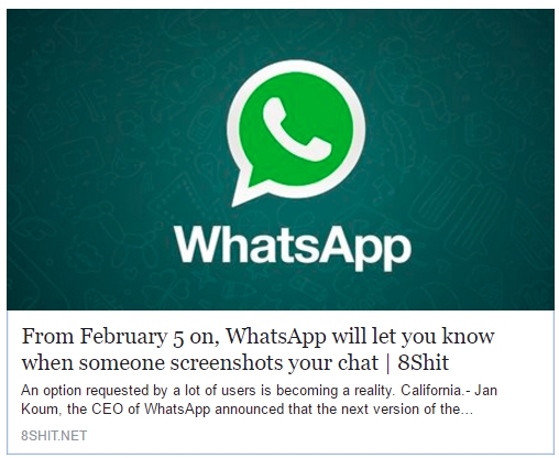 नई दिल्ली। एक ऑनलाइन रिपोर्ट में 23 जनवरी को दावा किया गया था कि जब भी कोई व्यक्ति आपके WhatsApp चैट की स्क्रीनशॉट लेगा, तो इसकी जानकारी यूजर को मिल जाएगी। हास्य आधारित वेबसाइट 8shit के मुताबिक, WhatsApp ने नया फीचर शुरू किया है।
