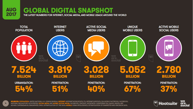 रिपोर्ट की मानें तो पूरी दुनिया में करीब 3.028 बिलियन एक्टिव सोशल मीडिया यूजर्स हैं। आपको बता दें कि दुनिया की जनसंख्या 7.524 बिलियन है। इसका मतलब दुनिया की करीब 40 फीसद जनसंख्या सोशल मीडिया का इस्तेमाल करती है। इनमें मोबाइल यूजर्स की बात करें तो इनकी संख्या 2.780 बिलियन है। वहीं, 3.819 बिलियन यूजर्स के पास इंटरनेट तो है लेकिन वो किसी भी सोशल मीडिया से जुड़े हुए नहीं हैं।