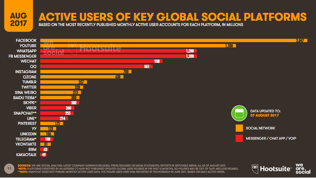 फेसबुक सभी सोशल मीडियो प्लेटफॉर्म्स का बादशाह है। आपको बता दें कि फेसबुक के करीब 2.047 बिलियन मासिक एक्टिव यूजर्स हैं। जबकि इसी की स्वामित्व वाले व्हाट्सएप और मैसेंजर 1200 बिलियन मासिक एक्टिव यूजर्स के मामले में तीसरे और चौथे स्थान पर हैं। वहीं, इंस्टाग्राम की बात करें तो इसके करीब 700 मिलियन मासिक एक्टिव यूजर्स हैं।