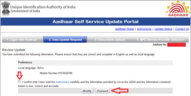 जरूरी कागजात अपलोड करने के बाद बीपीओ सर्विस प्रोवाइडर में से उचित विकल्प को चुनें। अब रिक्वेस्ट सबमिट कर दें। इसके बाद आपको अपडेट रिक्वेस्ट नंबर मिलेगा। इसे संभाल कर कहीं लिख लें। आप चाहें तो अपडेट रिक्वेस्ट की कॉपी को डाउनलोड या प्रिंट कर सकते हैं। बता दें कि यूआईडीएआई की वेबसाइट पर साफ लिखा है कि आधार डाटा में अपडेट के लिए आवेदन देने मात्र से जानकारी अपडेट नहीं होगी। आपने जो नई जानकारी दी है उसे जांचने के बाद ही अपडेट किया जाएगा।