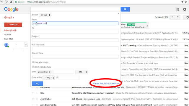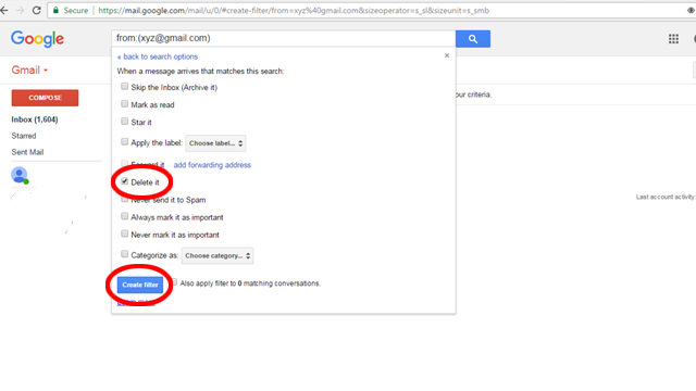 3- यहां एक फॉर्म ओपन होगा। इसमें आपको उस व्यक्ति की मेल आईडी डालनी होगी, जिसे आप ब्लॉक करना चाहते हैं। इसके बाद नीचे की तरफ दिए गए Create filter with this search पर क्लिक कर Delete It को चेक कर दें। इसके बाद Create filter पर क्लिक कर दें। ऐसा करने से उस खास ईमेल आईडी से आने वाले मेल अपने आप ट्रैश फोल्डर में चले जाएंगे। आपको इन ईमेल के लिए कोई नोटिफिकेशन नहीं मिलेगा और ये 30 दिन बाद अपने आप डिलीट हो जाएंगे।