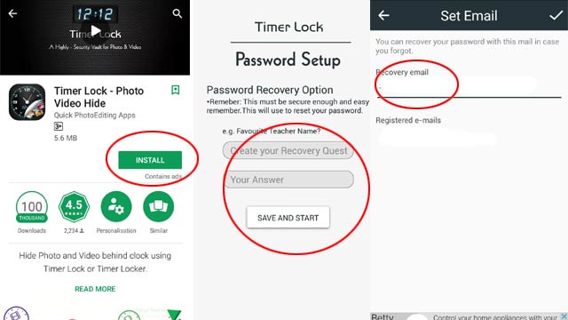 1- गूगल प्ले स्टोर से Timer Lock - Photo Video Hide एप का डाउनलोड करें। एप को इंस्टॉल कर ओपन करें। इसे ओपन करने पर आपके सामने जो विंडो ओपन होगी उसमें आपको पासवर्ड रिकवरी ऑप्शन डालना होगा। इसके बाद Save and Start पर टैप करें। अब एक और विंडो ओपन होगी जिसमें आपको रिकवरी ई-मेल आईडी एंटर करना होगा। एंटर करने के बाद ऊपर दिए गए टिक पर टैप कर दें।