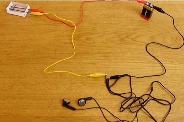 4. इसके बाद क्रोकोडाइल लीड्स की मदद से ग्रेफाइट लीड के एक हिस्से को सेल बैटरी से जोड दें और दूसरे हिस्से को 3.5 जैक इयरफोन से जोड़ दें। (ध्यान रहे कि दोनों क्रोकोडाइल लीड्स के कलर अलग हों)