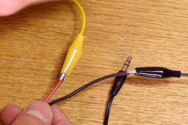 8. हैडफोन कनेक्ट करने के लिए वायर के एक हिस्से से क्रोकोडाइल कनेक्टर को जोड़ कर इयरफोन जैक के नीचे की तरफ जोड़ दें। और दूसरे तार के दूसरे हिस्से को दूसरे कनेक्टर से अटैच कर के इयरफोन के जैक में ऊपर की तरफ लगा दें।