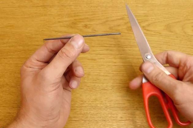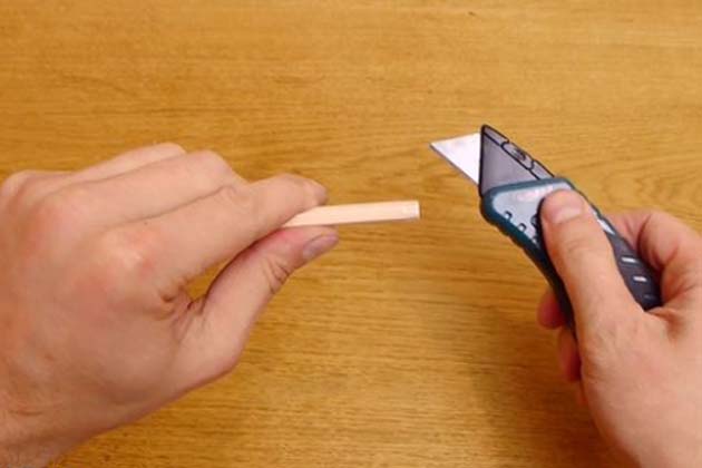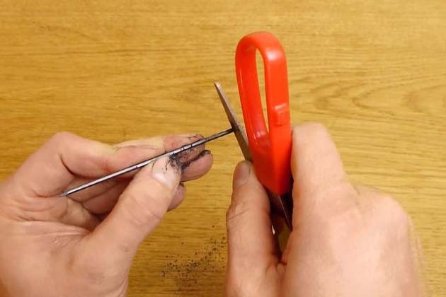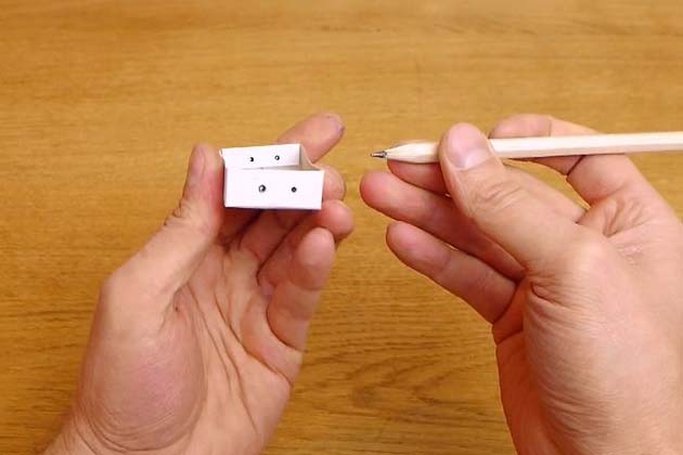 2. इसके बाद पेंसिल लीजिए और किसी चाकू की मदद से इसे ध्यान से काटिए। (ध्यान रहे कि इसके अंदर की ग्रेफाइट लीड न टूटे) अब इस लीड को तीन बराबर हिस्से में तोड़ लें। दो लीड में आगे के हिस्से को नुकीला कर पीछे के हिस्से को रगड़कर गोलाई खत्म कर चौकोर कर दें। अब इन लीड्स को माचिस के डिब्बे के एक छेद से दूसरे छेद में डालें।( दोनों लीड के नुकीले हिस्से एक तरफ होने चाहिए)