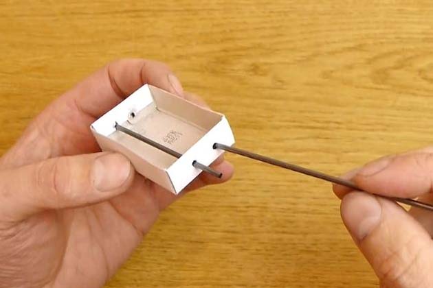 1. इसके लिए सबसे पहले एक खाली माचिस का डिब्बा लें। जहां तीलियां रखी जाती हैं उसमें दोनों तरफ दो-दो छेद करें। (ध्यान रहे कि चारों छेद एक-दूसरे के सामने होने चाहिए)