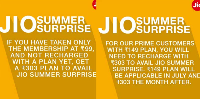 इस ऑफर के तहत फ्री सर्विस को तीन महीने तक के लिए बढ़ाया गया है। लेकिन ऑफर यही खत्म नहीं होता है। ध्यान देने वाली बात ये है कि अगर यूजर ने Summer Surprise ऑफर के एलान से पहले प्राइम सब्सक्रिप्शन लिया है और साथ में 303 रुपये का रीचार्ज कराया है, तो आपके लिए यह ऑफर जुलाई 2017 से लागू होगा। वहीं, अगर यूजर ने इस ऑफर के एलान के बाद प्राइम मेंबरशिप ली है, तो यूजर को 303 रुपये का रिचार्ज कराना होगा और तब ही फ्री सर्विस चालू रहेंगी। तीन महीने बाद 303 वाला प्लान शुरु हो जाएगा।