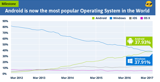 विंडोज को मात देते हुए एंड्रायड दुनिया का सबसे लोकप्रिय प्लेटफॉर्म बन गया है