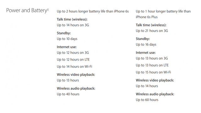 इन दोनों मॉडल्स में अब तक की सबसे ज्यादा बैटरी लाइफ दी गई है। iPhone 7 वाइ-फाइ यूज करने के दौरान 14 घंटे और 4जी इस्तेमाल करने पर 12 घंटे की बैटरी लाइफ देता है। वहीं, iPhone 7 वाइ-फाइ यूज करने के दौरान 15 घंटे और 4जी इस्तेमाल करने पर 15 घंटे की बैटरी लाइफ देता है।