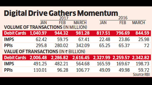 नोटबंदी के बाद से डेबिट कार्ड से होने वाले लेन-देन की संख्या जनवरी में 1 बिलियन के आंकड़े को पार कर गई। यह आंकड़ां बीते साल 817 मिलियन का रहा था। हालांकि एटीएम से होने वाले लेनदेन की संख्या लगभग 700 मिलियन पर स्थिर रही। डिजिटल पेमेंट के लिहाज से सबसे ज्यादा इजाफा पीओएस टर्मिनलों पर देखा गया है।