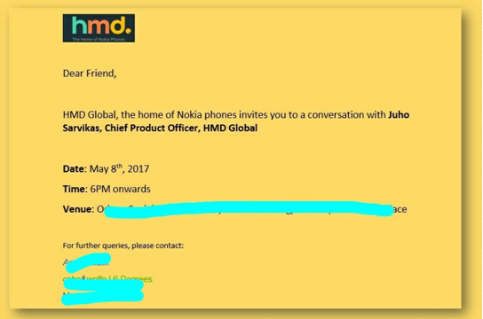 HMD ग्लोबल के प्रेस इनवाइट में लिखा है, “HMD ग्लोबल आपको मुख्य उत्पाद अधिकारी जूहो सरविकस के साथ बातचीत करने के लिए आमंत्रित करता है”। यह इवेंट 8 मई 2017 को शाम 6 बजे नई दिल्ली में आयोजित किए जाने की उम्मीद है। अनुमान लगाया जा रहा है कि इस इवेंट में नोकिया के सभी नए स्मार्टफोन्स और नोकिया 3310 को भारत में लॉन्च किया जाएगा। वहीं, फोन्स की कीमत और उपलब्धता के बारे में भी इवेंट में ही बताया जाएगा। इनकी कीमत एंट्री-लेवल और मिड-रेंज तक होने की उम्मीद लगाई जा रही है। हाल ही में कई खबरें आई थीं, जिसमें इन नोकिया फोन्स को मई या जून में लॉन्च (भारत) करने की बात कही गई थी।