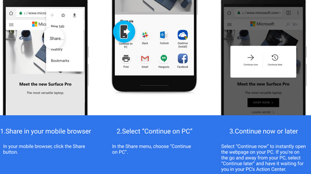 अपने फोन में जब किसी वेबसाइट पर जाते हैं और चाहते हैं कि वह पीसी पर दिखाई दे तो शेयर ऑप्शन में जाकर 'कन्टीन्यू ऑन पीसी' ऑप्शन को टैब करें। इसके लिए आपको माइक्रोसॉफ्ट अकाउंट में साइन-इन करने की जरूरत पड़गी (इसमें वही अकाउंट इस्तेमाल करना होगा जो पीसी में करते हैं)। 'कन्टीन्यू नाऊ' (वेबसाइट लिंक्ड पीसी पर ओपन हो जाएगी) या फिर 'कन्टीन्यू लेटर' (वेबसाइट एक्शन सेंटर पर दिखाई देने लगेगी) करें।