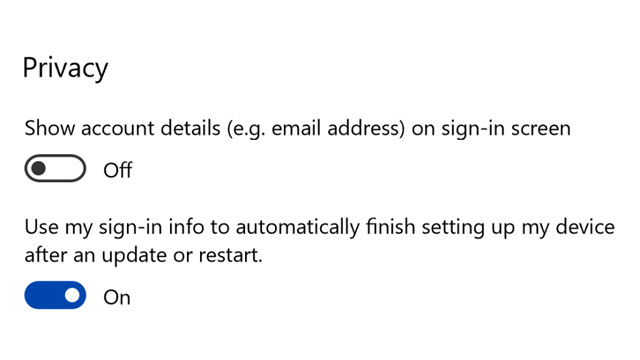 एडवांस्ड विंडोस अपडेट फीचर, जो अपडेट होने के लिए यूजर की साइन-इन इन्फो के जरिए डिवाइस पर सेटिंग्स को पूरा करता है, को रेग्यूलर रिबूट और शटडाउन फीचर तक सीमित कर दिया है। जब आप लॉग इन करते हैं और रिबूट या शट डाउन करने हैं तो विंडोज बैकअप को बूट करने के बाद यूजर के अकाउंट को ऑटोमैटिकली सेट कर देगा। इसका तेज साइन-इन और किसी भी एप्लिकेशन को ऑटोमैटिक लॉन्च किया जाएगा जो कि एप्लिकेशन रिस्टार्ट के लिए रजिस्टर्ड की गई है। अगर इस फंक्शन को डिलेबल करना चाहते हैं तो आप सेटिंग में जाकर साइन-इन ऑप्शन पेज में प्राइवेसी सेक्शन को चेंज कर दें। इसके अलावा इनपुट के तौर पर वन-हैंड टच कीबोर्ड को पहले से बड़ा कर दिया गया है।