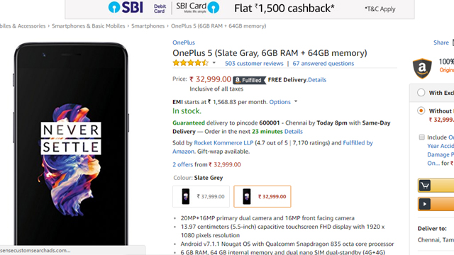OnePlus 5 की बिक्री अमेजन पर हुई शुरु, कैशबैक समेत मिल रहे कई आकर्षक ऑफर्स