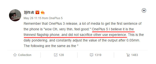 ऐसे में इस स्मार्टफोन को लेकर एक नई खबर ने दस्तक दी है। खबरों की माने तो, कंपनी अपने इस स्मार्टफोन को स्लिम बॉडी के साथ लॉन्च करेगी। आपको बता दें कि, कंपनी के CEO और संस्थापक Pete Lau ने इस स्मार्टफोन के बारे में जानकारी दी है। Pete Lau ने वेइबो पर एक पोस्ट शेयर करते हुए बताया कि वनप्लस 5 स्मार्टफोन “Thinnest Flagship phone” होने वाला है।