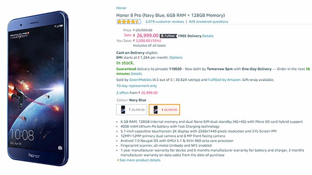 - इसमें हॉनर 8 प्रो 3000 रुपये के डिस्काउंट पर मिल रहा है। डिस्काउंट के बाद इस फोन की कीमत 26,999 रुपये रह गई है। इसका लॉन्च प्राइज 29,999 रुपये है।