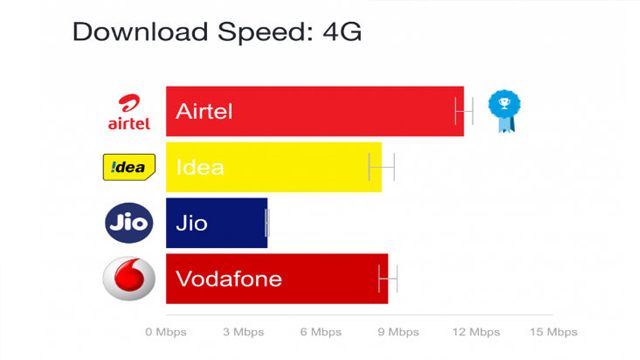 रिपोर्ट के अनुसार, एयरटेल की औसत पीक स्पीड 56.6 mbps है जो कि इसकी औसत 4जी डाउनलोड टेस्ट स्पीड 11.5 mbps से 5 गुना ज्यादा है। वहीं, रिलायंस जियो की औसत 4जी स्पीड सबसे कम है। हालांकि, औसत पीक स्पीड के मामले में जियो दूसरे स्थान पर है। जियो की औसत पीक स्पीड 50 एमबीपीएस है जो कि इसकी औसत डाउनलोड स्पीड 3.9 mbps से 13 गुना ज्यादा है। इसके अलावा वोडाफोन और आइडिया की औसत पीक स्पीड इनकी औसत डाउनलोड स्पीड से 4 गुना ज्यादा है। डाटा के अनुसार, जियो पीक स्पीड इसकी औसत स्पीड से ज्यादा है। ओपनसिग्नल ने अपने ब्लॉगपोस्ट में लिखा है, “जियो का नेटवर्क ओवर लोडेड हो गया है। नेटवर्क कंजेशन की वजह से जियो स्लो हो रहा है, क्योंकि दूसरे ऑपरेटर्स की तुलने में इससे लोग ज्यादा जुड़ रहे हैं”।