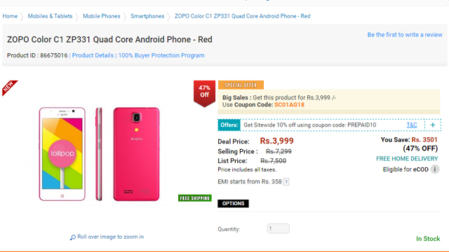 Zopo कंपनी ने अपने Colour C1 स्मार्टफोन पर 47 फीसदी की कटौती की है। यह फोन एक्सक्लूसिव तौर पर शॉपक्लूज से महज 3999 रुपये में खरीदा जा सकता है
