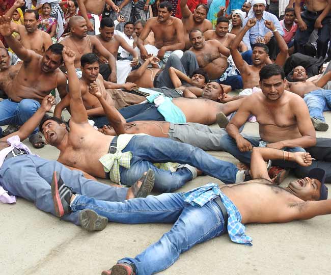 यूपी में शिक्षामित्रों का अर्द्धनग्न होकर प्रदर्शन और पुतला दहन