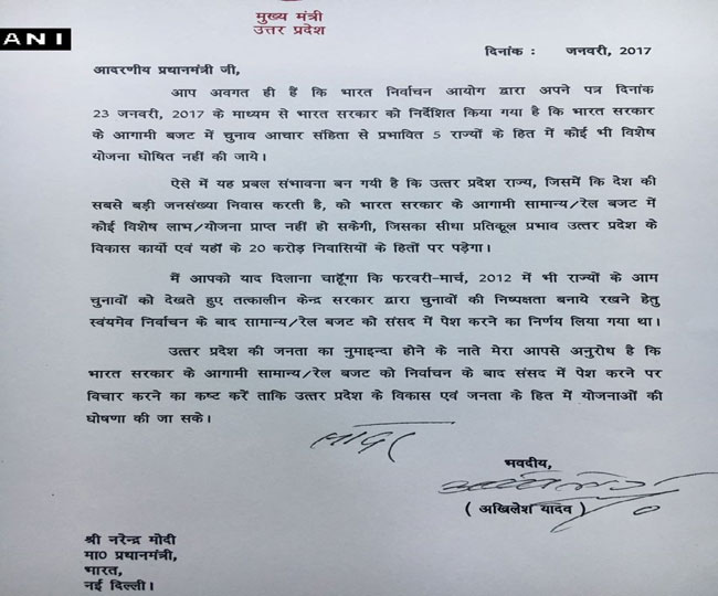 मुख्यमंत्री अखिलेश यादव ने कल प्रधानमंत्री नरेंद्र मोदी को पत्र लिखकर मांग की है आम बजट को विधानसभा चुनाव के बाद पेश करने पर विचार करें, ताकि उत्तर प्रदेश के विकास व जनता के हित में योजनाओं की घोषणा हो सके। अखिलेश ने अपने पत्र में चुनाव आयोग की ओर से भारत सरकार को 23 जनवरी को जारी किए गए पत्र का हवाला देते हुए लिखा है।इस पत्र में आयोग ने निर्देश दिया है कि भारत सरकार के आगामी बजट में चुनाव आचार संहिता से प्रभावित पांच राज्यों के हित में कोई भी विशेष योजना घोषित नहीं की जाए।