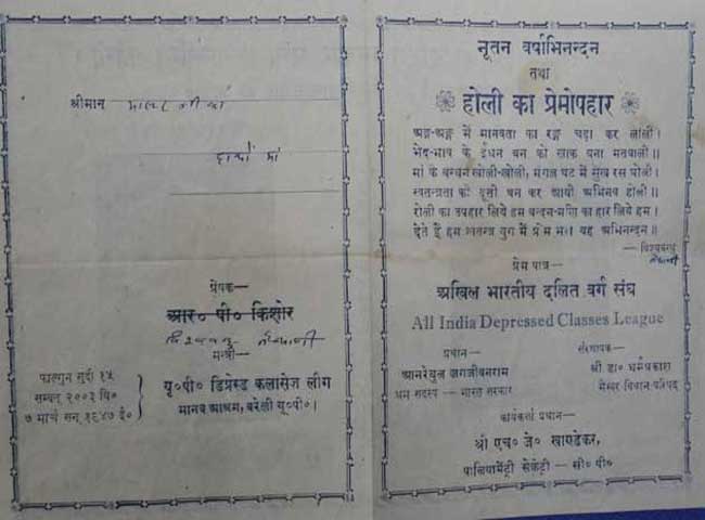 ऐसे ही शुभकामना पत्र सात मार्च 1947 को मानव आश्रम बरेली, उप्र. के मंत्री विश्वबंधु नैथाणी की ओर भी भेजे गए। जो उन्होंने अखिल भारतीय दलित वर्ग संघ के प्रधान जगजीवन राम, संस्थापक डॉ. धर्मप्रकाश व कार्यकर्ता प्रधान एचजे खांडेकर के सहयोग से छपवाए थे। इस पत्र में एक तरफ नूतन वर्ष का अभिनंदन और होली के 'प्रेमोपहार' स्वरूप कविता छपी हुई थी तो दूसरी ओर महात्मा गांधी व जवाहरलाल नेहरू के उद्गार थे। हालांकि, पत्र में आजादी की पुरानी तिथि जून 1948 अंकित है, क्योंकि इनकी छपाई ब्रिटिश प्रधानमंत्री क्लेमेंट एटली की घोषणा के तुरंत बाद हो गई थी।